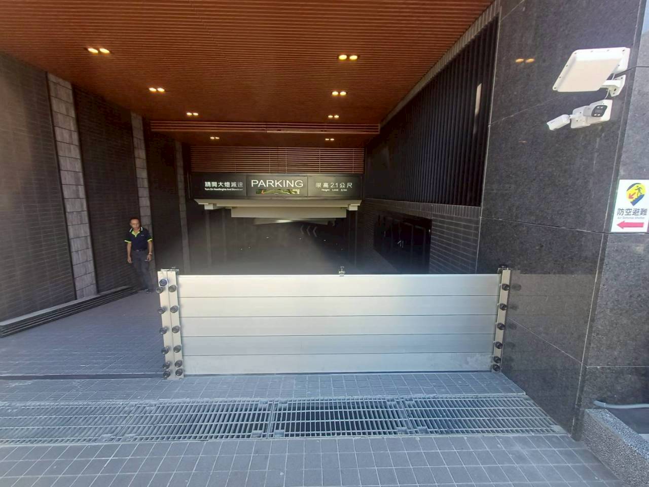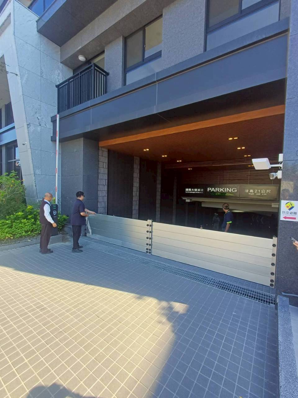 影片分享 | 防水門安裝|車道分出入二段式,大雨特報來時,可先單邊組裝,另一邊,尚可出入