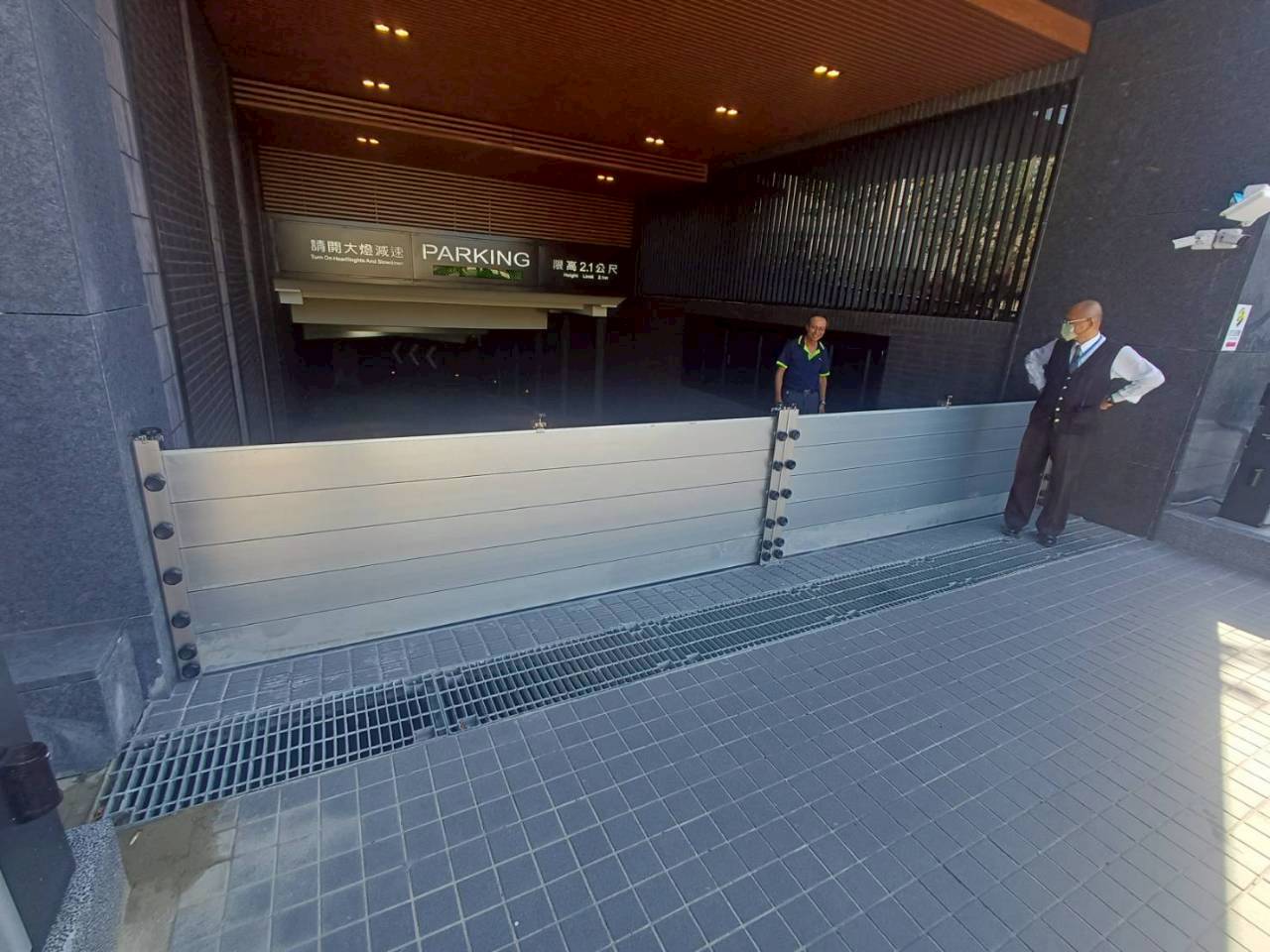 防水門安裝|車道分出入二段式,大雨特報來時,可先單邊組裝,另一邊,尚可出入